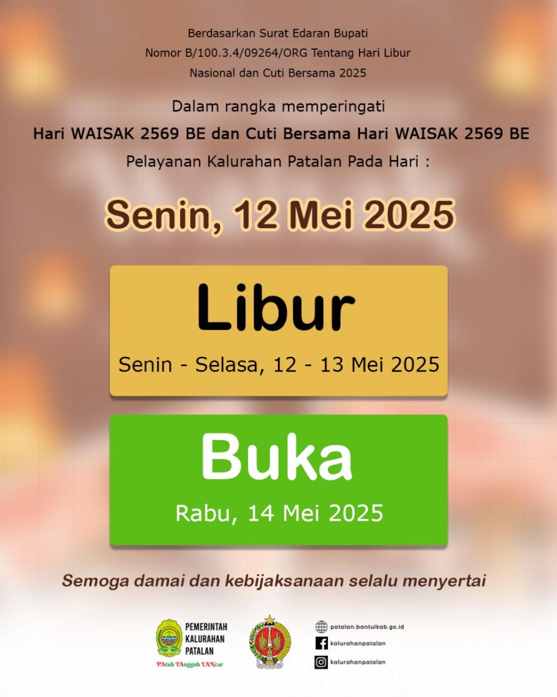 Dalam rangka memperingati Hari Raya Waisak, Pelayanan pemerintah Kalurahan Patalan hari Senin-selasa, 12 -13 Mei 2025 Libur.