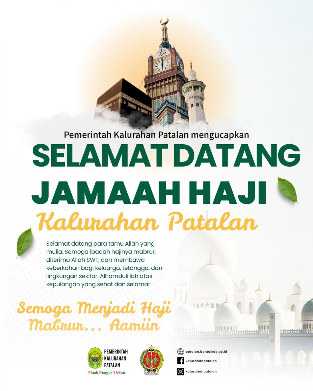 Alhamdulillah, dengan penuh syukur kami menyambut kepulangan Bapak/Ibu Jamaah Haji Kalurahan Patalan. Selamat datang kembali di tanah air! Semoga predikat haji mabrur senantiasa menyertai, dan membawa cahaya keimanan yang lebih terang bagi kita semua. Selamat berkumpul kembali bersama keluarga tercinta. ✨