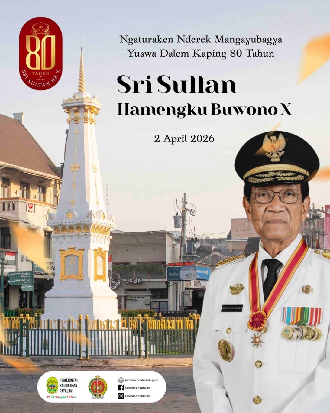 Pemerintah Kalurahan Patalan mengucapkan selamat ulang tahun ke-80 kepada Sri Sultan Hamengku Buwono X, Raja Kasultanan Ngayogyakarta sekaligus Gubernur DIY pada 2 April 2026.