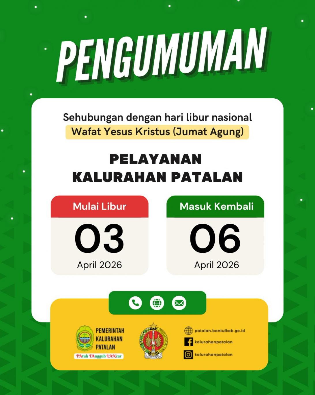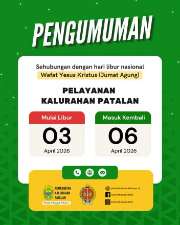 Sehubungan dengan Hari Libur Nasional Wafat Yesus Kristus (Jumat Agung), diberitahukan kepada seluruh warga Kalurahan Patalan bahwa operasional pelayanan kantor kalurahan diatur sebagai berikut: